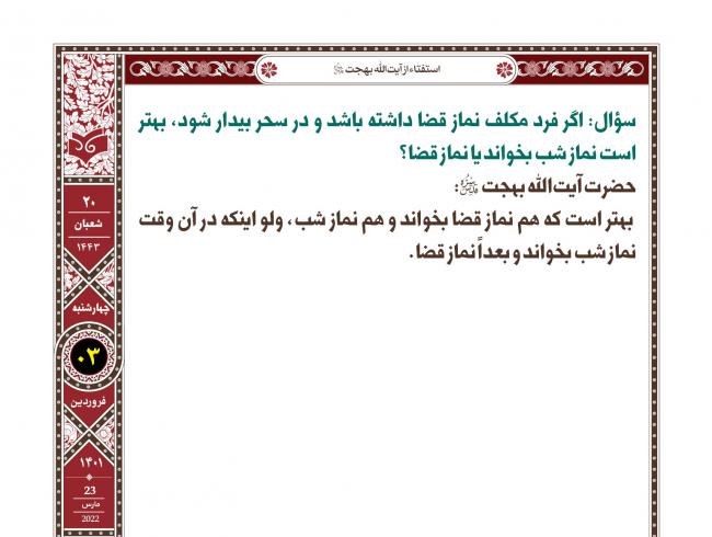 سؤال: اگر فرد مکلف نماز قضا داشته باشد و در سحر بیدار شود، بهتر است نماز شب بخواند یا نماز قضا؟