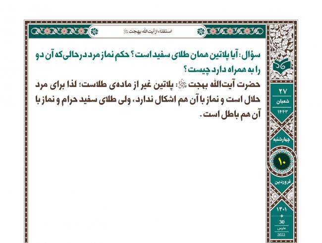 سؤال: آیا پلاتین همان طلای سفید است؟ حکم نماز مرد درحالیکه آن دو را به همراه دارد چیست؟