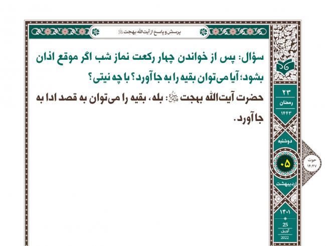 سؤال: پس از خواندن چهار رکعت نماز شب اگر موقع اذان بشود؛ آيا مىتوان بقيه را به جا آورد؟ با چه نيتى؟