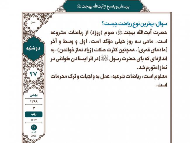 صوم (روزه) از ریاضات مشروعه است. ماهی سه روز خیلی مؤکد است. اول و وسط و آخر [ماههای قمری]. همچنین کثرت صلات (زیاد نماز خواندن)، به اندازهای که پای حضرت رسول صلیاللهعلیهوآله [در اثر ایستادن طولانی در نماز] متورم شد.
