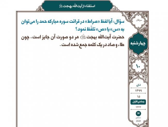 سؤال: آيا لفظ «صراط» در قرائت سوره مبارکه حمد را مىتوان به «س» يا «ص» تلفّظ نمود؟