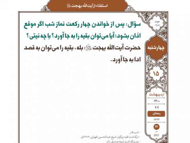 سؤال: پس از خواندن چهار رکعت نماز شب اگر موقع اذان بشود؛ آيا مىتوان بقيه را به جا آورد؟ با چه نيتى؟