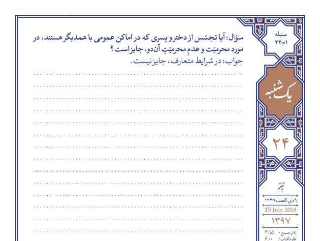 شبکههای اجتماعی عکسنوشت یکشنبه ۱٧ تیرماه ١٣٩٧ پرسش و پاسخ از آیت الله بهجت ... اصل حجاب از ضروریات و نص قرآن است؛ و کسانی که به این دستور بیاعتنایی میکنند، کار حرام انجام میدهند و باید توبه نمایند. ... عکسنوشت رساله عملیه پرسشها و پاسخها استفتائات شبکههای اجتماعی تصاویر چند رسانهای احکام موضوعات خانواده ۰ ۱۳:۴۵، ۱۳۹۷-۰۴-۱۷