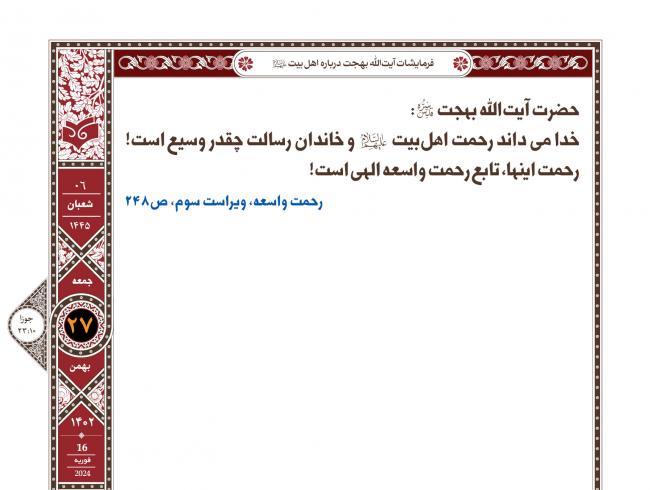 حضرت آیت‌الله بهجت قدس‌سره: خدا می داند رحمت اهل‌بیت علیهم‌السلام و خاندان رسالت چقدر وسیع است! رحمت اینها، تابع رحمت واسعه الهی است! رحمت واسعه، ویراست سوم، ص٢۴٨     ...