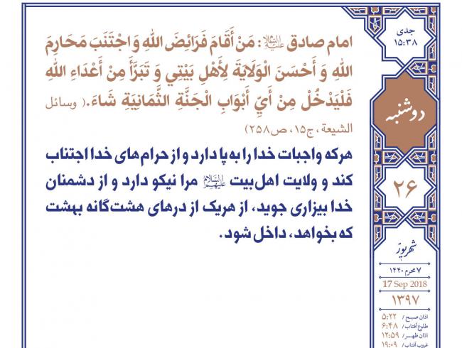 امام صادق علیه‌السلام: هرکه واجبات خدا را به‌پا دارد و از حرام‌هاى خدا اجتناب کند و ولايت اهل‌بيت علیهم‌السلام مرا نيکو دارد و از دشمنان خدا بيزارى جويد، از هريک از درهاى هشت‌گانه بهشت که بخواهد، داخل شود. وسائل الشيعة، ج١۵، ص٢۵٨ ...