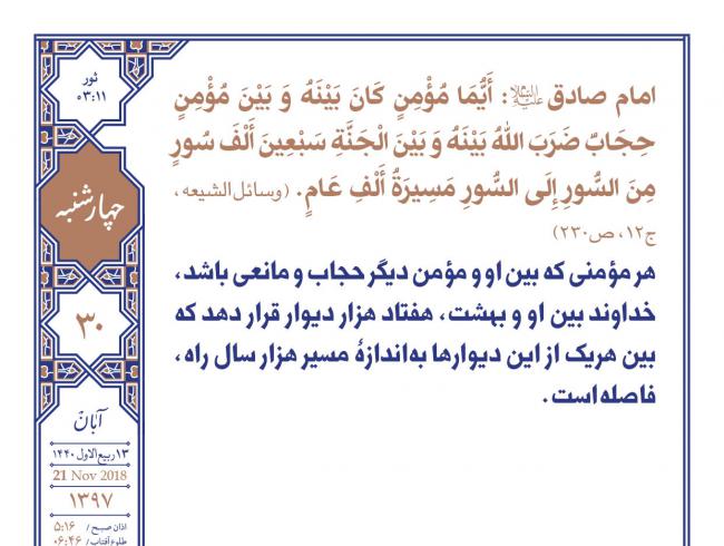 امام صادق علیه‌السلام:‌ هر مؤمنی که بین او و مؤمن دیگر حجاب و مانعی باشد، خداوند بین او و بهشت، هفتاد هزار دیوار قرار دهد که بین هریک از این دیوارها به‌اندازۀ مسیر هزار سال راه، فاصله است. وسائل‌الشیعه، ج١٢، ص٢٣٠   ...