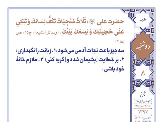 سه چيز باعث نجات آدمی می شود: ١. زبانت را نگهداری ؛ ٢. بر خطايت [پشيمان شده و] گريه کنی ؛ ٣. ملازم خانۀ خود باشی.