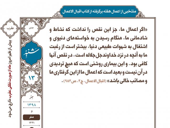«اگر اعمال ما، جز این نقص را نداشت که نشاط و شادمانی ما، هنگام رسیدن به خواستههای دنیوی و اشتغال به شهوات طبیعی دنیا، بیشتر است از رغبت ما به آنچه در نزد خداوندجلجلاله است، در نقص آنها کافی بود. و این بیماری روشنی است که هیچ تردیدی در آن نیست و بعید است که اعمال ما از این گرفتاریها و مصائب خالی ب...