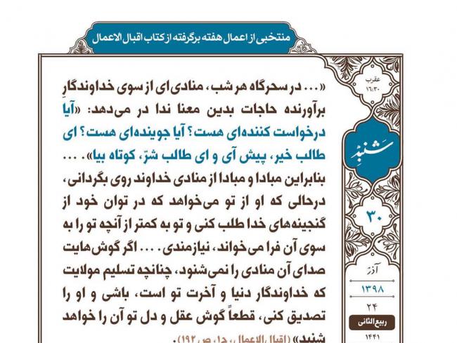 ... در سحرگاه هر شب، منادی از سوی خداوندگارِ برآورنده حاجات ندا میدهد: «آیا درخواست کنندهای هست؟ آیا جویندهای هست؟ ای طالب خیر، پیش آی و ای طالب شرّ، کوتاه بیا».