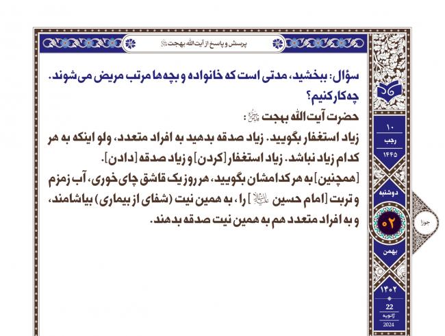 سؤال: ببخشید، مدتی است که خانواده و بچه‌ها مرتب مریض می‌شوند. چه‌کار کنیم؟   حضرت آیت‌الله بهجت قدس‌سره: زیاد استغفار بگویید. زیاد صدقه بدهید به افراد متعدد، ولو اینکه به هر کدام زیاد نباشد. زیاد استغفار [کردن] و زیاد صدقه [دادن]. [همچنین] به هر کدامشان بگویید، هر روز یک قاشق چای‌خوری، آب زمزم و ترب...