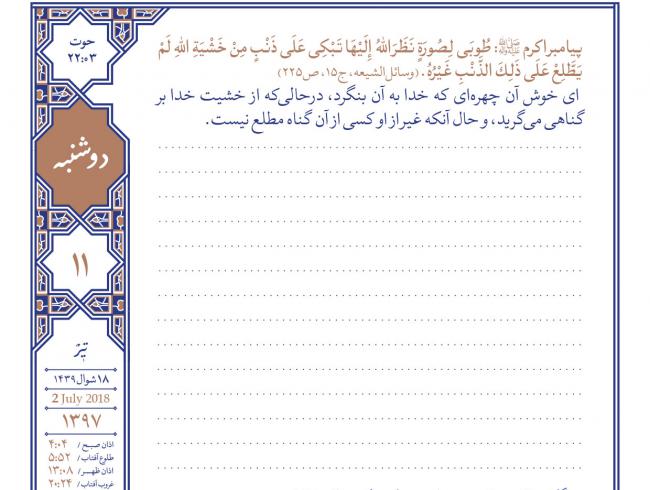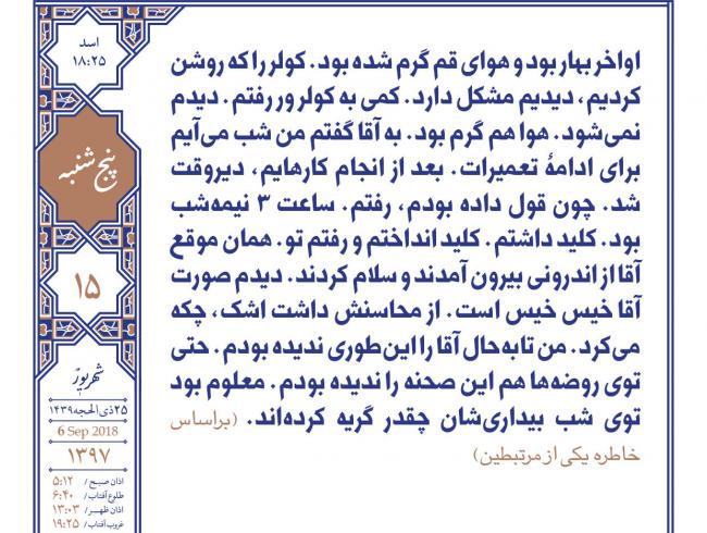 [حضرت آیتالله بهجت قدسسره] شیر آب حیاط را بهاندازۀ یک شیر سماور باز کرده بودند و داشتند وضو میگرفتند. گفتم: آقا، محرم دارد میآید و من یک ماه برای تبلیغ میروم. سفارشی کنید که آویزه گوشم کنم. همانجور که وضو میگرفت، تکیه داد به دیوار و آهسته گفت: «آسید محمد! سعی کن هر شبانهروزی یکمرتبه برای ا...