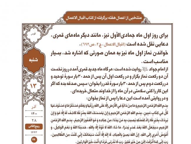 برای روز اول ماه جمادیالأول نیز، مانند دیگر ماههای قمری، دعایی نقل شده است.