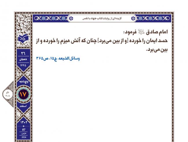 فرمود: مثلاً مردی اطعام میکند و با همسایگانش نیکرفتاری مینماید و از مهمان و واردین به خوبی پذیرایی میکند، ولی چون دری از حرام به رویش گشوده شود، از آن داخل میگردد؛ این عمل بد...