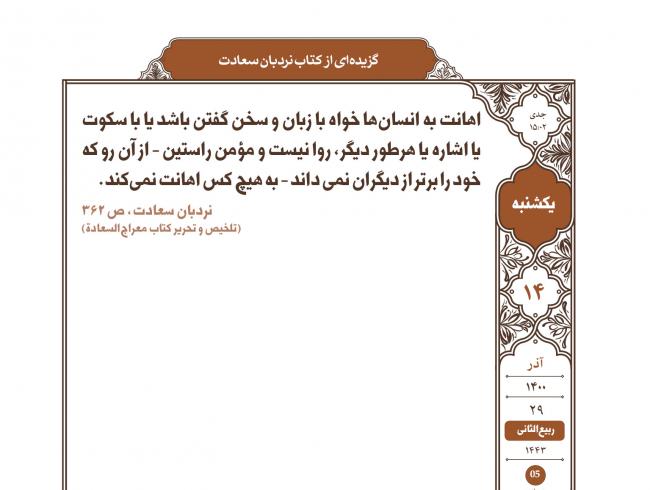 اهانت به انسان‌ها خواه با زبان و سخن گفتن باشد یا با سکوت یا اشاره یا هرطور دیگر، روا نیست و مؤمن راستین - از آن رو که خود را برتر از دیگران نمی داند - به هیچ کس اهانت نمی‌کند. نردبان سعادت، ص ۳۶۲ (تلخیص و تحریر کتاب معراج‌السعادة) ...