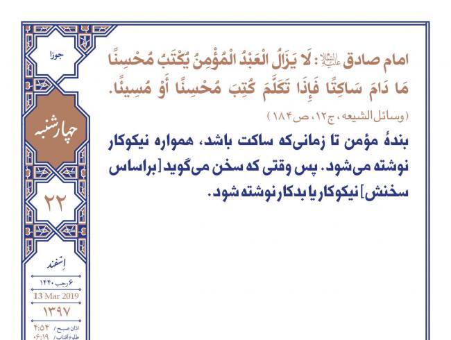 امام صادق علیه السلام: بندۀ مؤمن تا زمانی که ساکت باشد، همواره نیکوکار نوشته می شود. پس وقتی که سخن می گوید [براساس سخنش] نیکوکار یا بدکار نوشته شود. وسائل الشیعه، ج ١٢، ص١٨۴   ...
