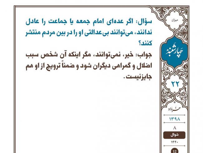 سؤال: اگر عده‌ای امام جمعه یا جماعت را عادل ندانند، می‌توانند بی‌عدالتی او را در بین مردم منتشر کنند؟ حضرت آیت‌الله بهجت قدس‌سره: خیر، نمی‌توانند، مگر اینکه آن شخص سبب اضلال و گمراهی دیگران شود و ضمناً ترویج از او هم جایز نیست. ...