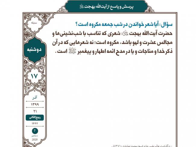 سؤال: آیا شعر خواندن در شب جمعه مکروه است؟ جواب: شعری که تناسب با شب‌نشینی‌ها و مجالس عشرت و لهو باشد، مکروه است؛ نه شعرهایی که در آن ذکر خدا و مناجات و یا در مدح ائمه اطهار و پیغمبر صلی‌الله‌علیه‌وآله‌وسلم است.۱ در محضر بهجت، ج۱، ص۲۸۳  ...
