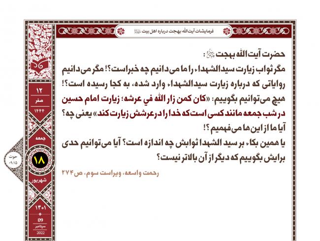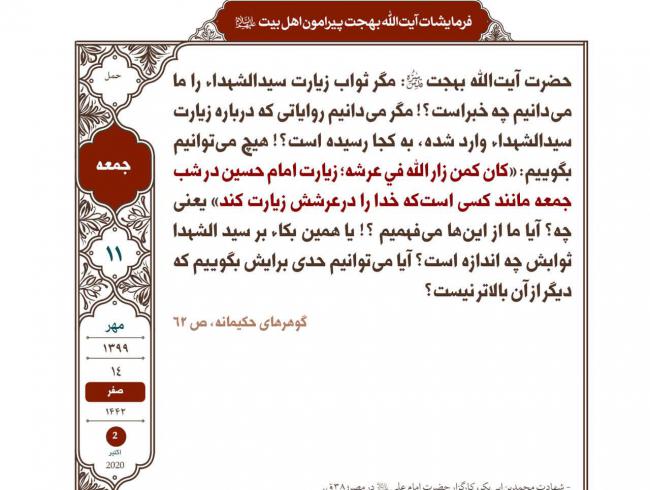 حضرت آیت‌الله بهجت قدس‌سره: مگر ثواب زيارت سيدالشهداء را ما می‌دانيم چه خبراست؟! مگر می‌دانيم رواياتی كه درباره زيارت سيدالشهداء وارد شده،‌ به كجا رسيده است؟! هيچ می‌توانيم بگوييم: «كان كمن زار الله في عرشه؛ زيارت امام حسين در شب جمعه مانند كسی است‌كه خدا را درعرشش زيارت كند» يعنی چه؟ آيا ما از اين‌...