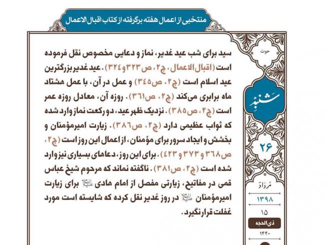 سید برای شب عید غدیر، نماز و دعایی مخصوص نقل فرموده است . عید غدیر بزرگترین عید اسلام است و عمل در آن، با عمل هشتاد ماه برابری میکند . روزه آن، معادل روزه عمر است نزدیک ظهر عید، دو رکعت نماز وارد شده که ثواب عظیمی دارد . زیارت امیرمؤمنان و بخشش و ایجاد سرور برای مؤمنان، از اعمال این روز است . برا...