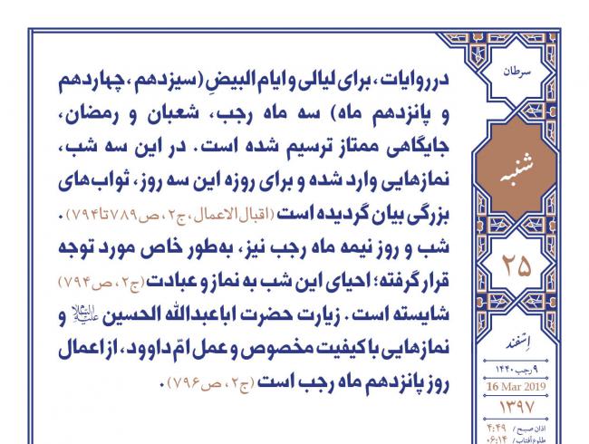 در روایات، برای لیالی و ایام البیضِ (سیزدهم، چهاردهم و پانزدهم ماه) سه ماه رجب، شعبان و رمضان، جایگاهی ممتاز ترسیم شده است. در این سه شب، نمازهایی وارد شده و برای روزه این سه روز، ثوابهای بزرگی بیان گردیده است. شب و روز نیمه ماه رجب نیز، بهطور خاص مورد توجه قرار گرفته؛ احیای این شب به نماز و عبادت...