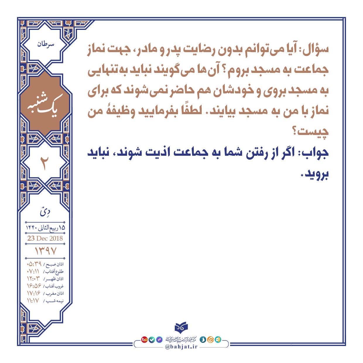 سؤال: آيا مىتوانم بدون رضايت پدر و مادر، جهت نماز جماعت به مسجد بروم؟ آنها مىگويند نبايد به تنهايى به مسجد بروى و خودشان هم حاضر نمىشوند كه براى نماز با من به مسجد بيايند. لطفًا بفرماييد وظيفۀ من چيست؟