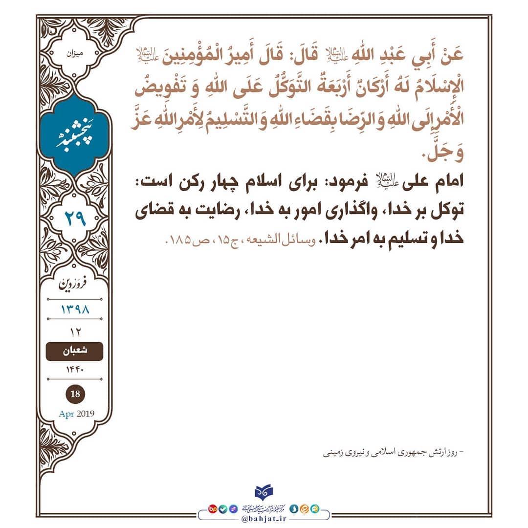 برای اسلام چهار رکن است: توکل بر خدا، واگذاری امور به خدا، رضایت به قضای خدا و تسلیم به امر خدا.