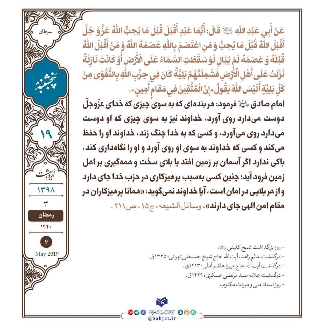هر بندهای که به سوی چیزی که خدای عزّوجلّ دوست میدارد روی آورد، خداوند نیز به سوی چیزی که او دوست میدارد روی میآورد، و کسی که به خدا چنگ زند، خداوند او را حفظ میکند و کسی که خداوند به سوی او روی آورد و او را نگاهداری کند، باکی ندارد اگر آسمان بر زمین افتد یا بلای سخت و همهگیری بر اهل زمین فرود آید؛ چنین کسی بهسبب پرهیزکاری در حزب خدا جای دارد و از هر بلایی در امان است، آیا خداوند نمیگوید: «همانا پرهیزکاران در مقام امن الهی جای دارند».