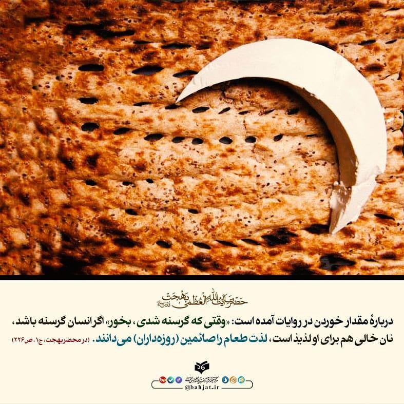 دربارۀ مقدار خوردن در روایات آمده است: «وقتی که گرسنه شدی، بخور» اگر انسان گرسنه باشد، نان خالی هم برای او لذیذ است، لذت طعام را صائمین (روزه‌داران) می‌دانند.