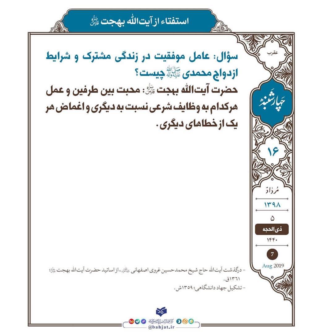 حضرت آیت‌الله بهجت قدس‌سره: محبت بین طرفین و عمل هرکدام به وظایف شرعی نسبت به دیگری و اغماض هر یک از خطاهای دیگری.