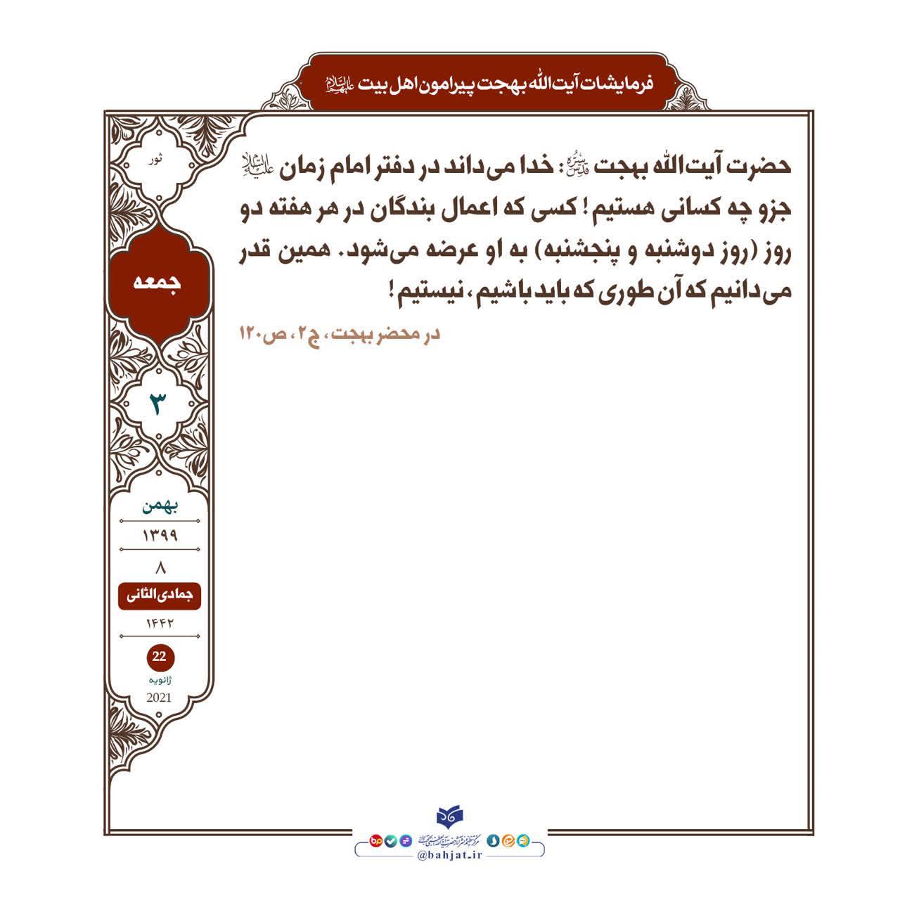 خدا می‌داند در دفتر امام زمان علیه‌السلام جزو چه کسانی هستیم! کسی که اعمال بندگان در هر هفته دو روز (روز دوشنبه و پنجشنبه) به او عرضه می‌شود. همین قدر می‌دانیم که آن طوری که باید باشیم، نیستیم!