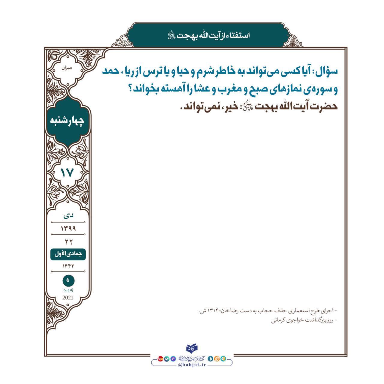 سؤال: آيا کسى مى‌تواند به خاطر شرم و حيا و يا ترس از ريا، حمد و سوره‌ى نمازهاى صبح و مغرب و عشا را آهسته بخواند؟