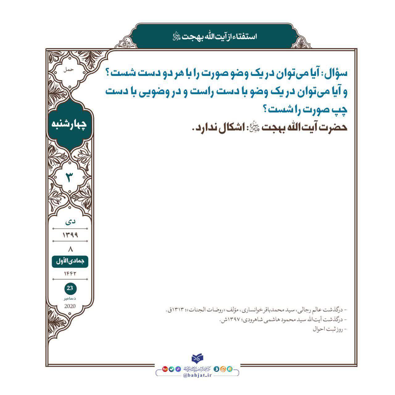 سؤال: آيا مى‌توان در يک وضو صورت را با هر دو دست شست؟ و آيا مى‌توان در يک وضو با دست راست و در وضويى با دست چپ صورت را شست؟