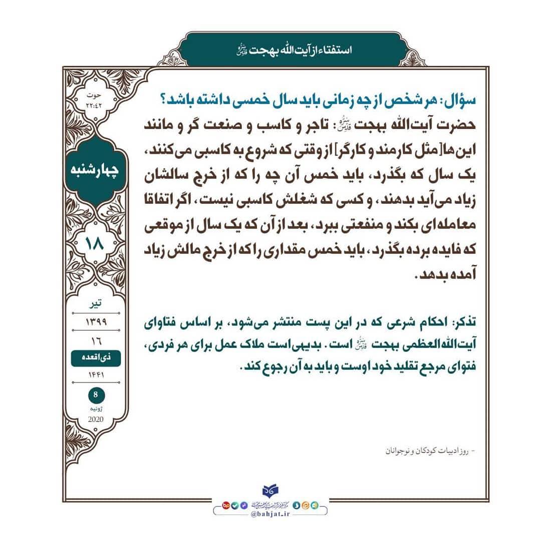 تذکر: احکام شرعی که در این پست منتشر میشود، بر اساس فتاوای آیتاللهالعظمی بهجت قدسسره است. بدیهیاست ملاک عمل برای هر فردی، فتوای مرجع تقلید خود اوست و باید به آن رجوع کند.