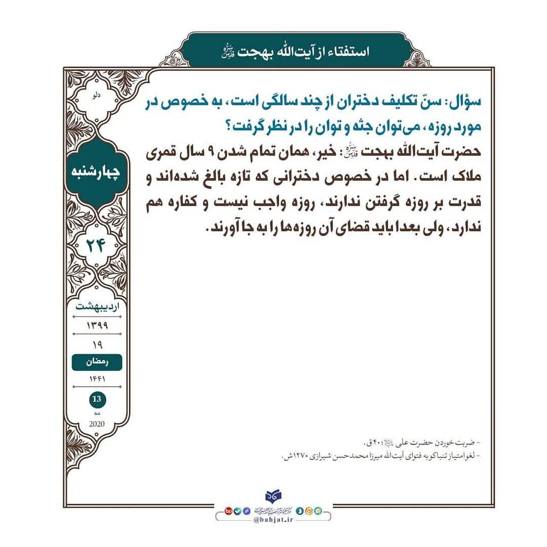 حضرت آیت‌الله بهجت قدس‌سره: خير، همان تمام شدن ٩ سال قمرى ملاک است. اما در خصوص دخترانى که تازه بالغ شده‌اند و قدرت بر روزه گرفتن ندارند، روزه واجب نيست و کفاره هم ندارد، ولى بعدا بايد قضاى آن روزه‌ها را به جا آورند.
