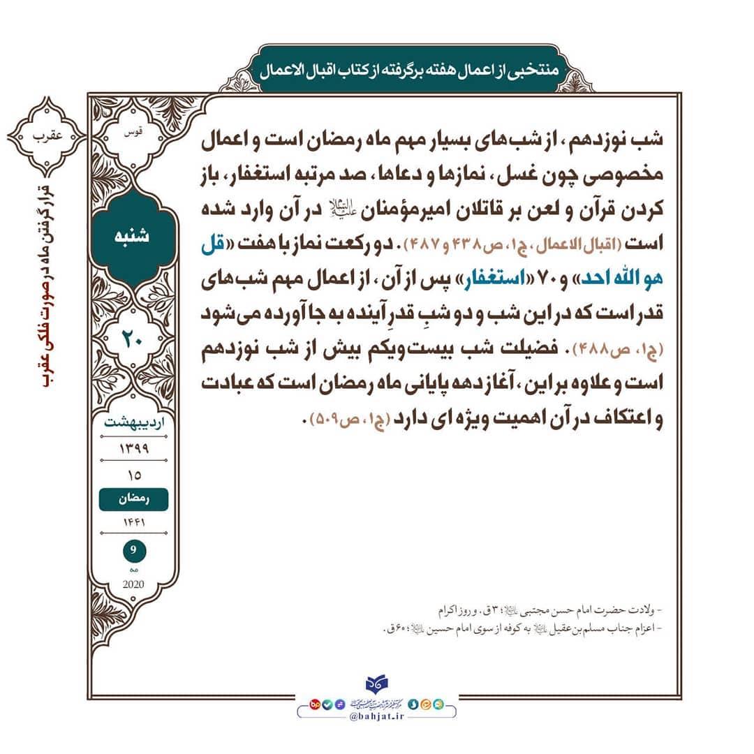 شب نوزدهم، از شبهای بسیار مهم ماه رمضان است و اعمال مخصوصی چون غسل، نمازها و دعاها، صد مرتبه استغفار، باز کردن قرآن و لعن بر قاتلان امیرمؤمنان علیهالسلام در آن وارد شده است. دو رکعت نماز با هفت «قل هو الله احد» و ۷۰«استغفار» پس از آن، از اعمال مهم شبهای قدر است که در این شب و دو شبِ قدرِ آینده به جا آورده میشود. فضیلت شب بیستویکم بیش از شب نوزدهم است و علاوه بر این، آغاز دهه پایانی ماه رمضان است که عبادت و اعتکاف در آن اهمیت ویژه ای دارد