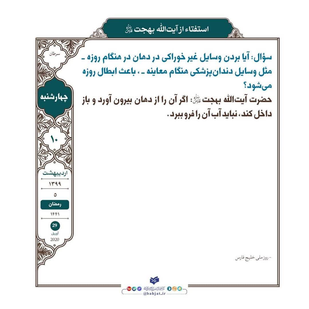 حضرت آیتالله بهجت قدسسره: اگر آن را از دهان بيرون آورد و باز داخل کند، نبايد آب آن را فرو ببرد. .
