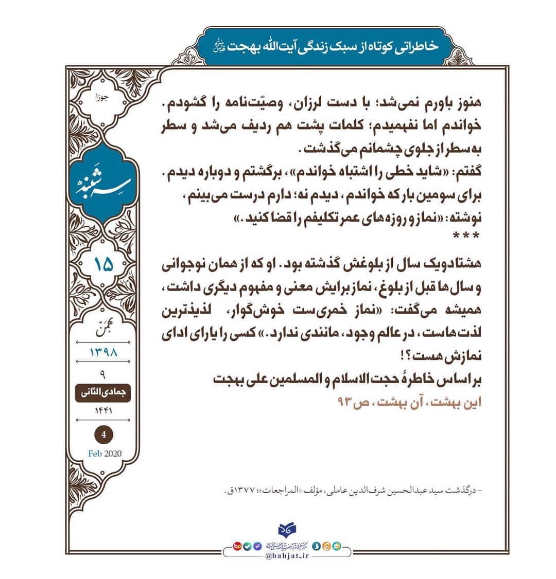 هشتادویک سال از بلوغش گذشته بود. او که از همان نوجوانی و سالها قبل از بلوغ، نماز برایش معنی و مفهوم دیگری داشت، همیشه میگفت: «نماز خمریست خوشگوار، لذیذترین لذتهاست، در عالم وجود، مانندی ندارد.» کسی را یارای ادای نمازش هست؟!