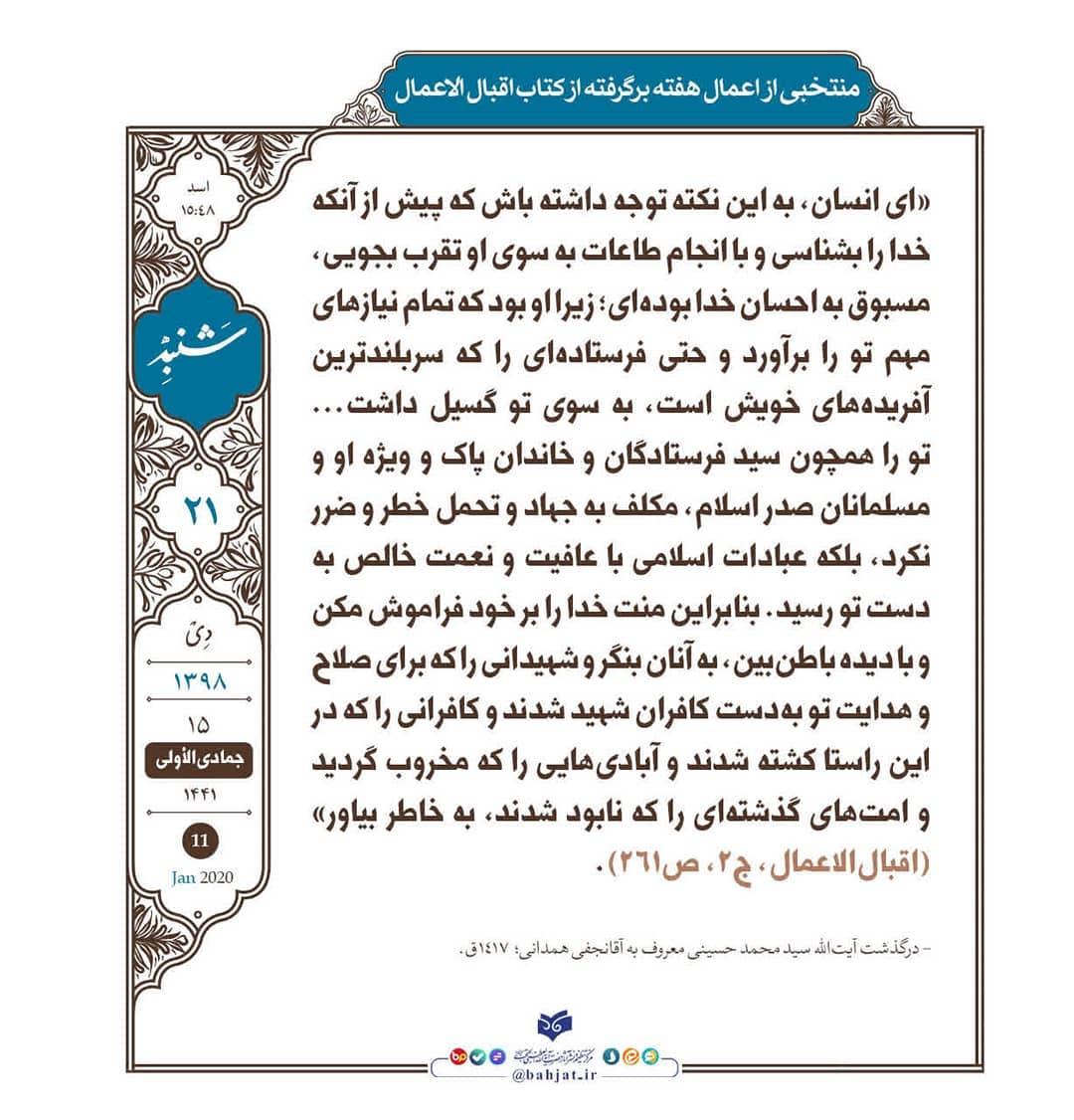 «ای انسان، به این نکته توجه داشته باش که پیش از آنکه خدا را بشناسی و با انجام طاعات به سوی او تقرب بجویی، مسبوق به احسان خدا بودهای؛ زیرا او بود که تمام نیازهای مهم تو را برآورد و حتی فرستادهای را که سربلندترین آفریدههای خویش است، به سوی تو گسیل داشت... تو را همچون سید فرستادگان و خاندان پاک و ویژه او و مسلمانان صدر اسلام، مکلف به جهاد و تحمل خطر و ضرر نکرد، بلکه عبادات اسلامی با عافیت و نعمت خالص به دست تو رسید. بنابراین منت خدا را بر خود فراموش مکن و با دیده باطنبین، به آنان بنگر و شهیدانی را که برای صلاح و هدایت تو بهدست کافران شهید شدند و کافرانی را که در این راستا کشته شدند و آبادیهایی را که مخروب گردید و امتهای گذشتهای را که نابود شدند، به خاطر بیاور».