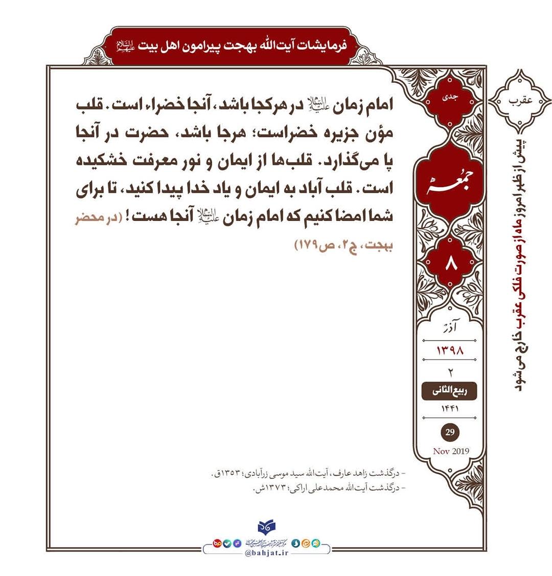 امام زمان علیهالسلام در هرکجا باشد، آنجا خضراء است. قلب مؤن جزیره خضراست؛ هرجا باشد، حضرت در آنجا پا میگذارد. قلبها از ایمان و نور معرفت خشکیده است. قلب آباد به ایمان و یاد خدا پیدا کنید، تا برای شما امضا کنیم که امام زمان علیهالسلام آنجا هست!