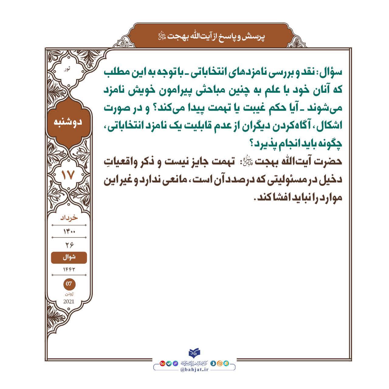 سؤال: نقد و بررسی نامزدهای انتخاباتی _ با توجه به این مطلب که آنان خود با علم به چنین مباحثی پیرامون خویش نامزد میشوند _ آیا حکم غیبت یا تهمت پیدا میکند؟ و در صورت اشکال، آگاهکردن دیگران از عدم قابلیت یک نامزد انتخاباتی، چگونه باید انجام پذیرد؟