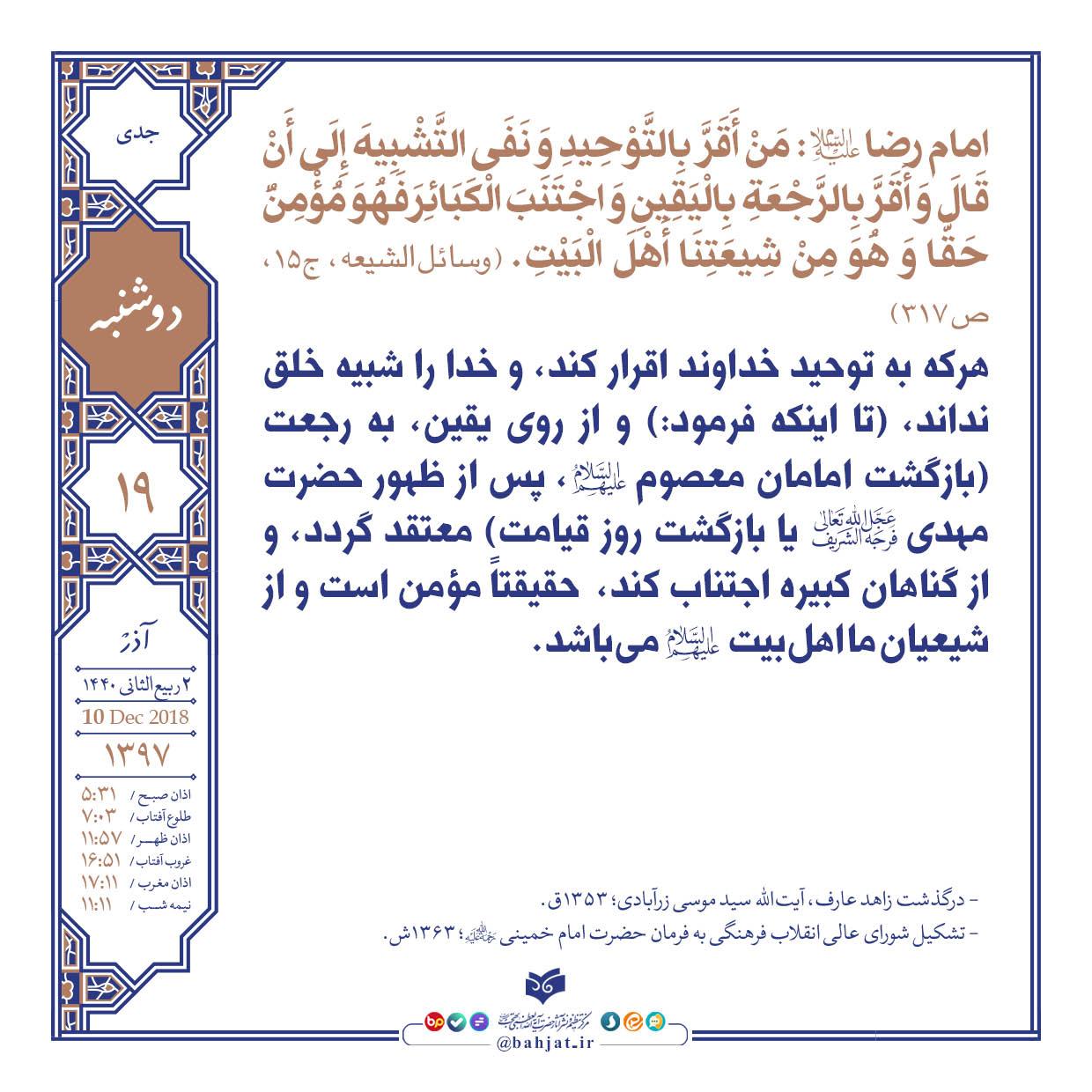 هرکه به توحيد خداوند اقرار کند، و خدا را شبيه خلق نداند، (تا اينکه فرمود:) و از روى يقين، به رجعت (بازگشت امامان معصوم علیهمالسلام، پس از ظهور حضرت مهدى(عج) يا بازگشت روز قيامت) معتقد گردد، و از گناهان کبيره اجتناب کند، حقیقتاً مؤمن است و از شيعيان ما اهلبیت علیهمالسلام مىباشد.