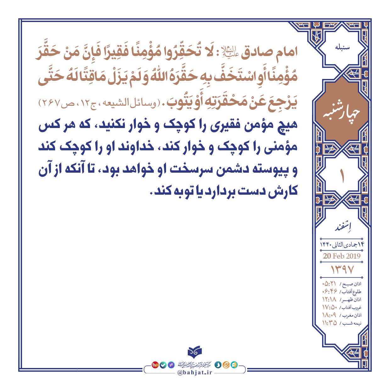 هیچ مؤمن فقیری را کوچک و خوار نکنید، که هر کس مؤمنی را کوچک و خوار کند، خداوند او را کوچک کند و پیوسته دشمن سرسخت او خواهد بود، تا آنکه از آن کارش دست بردارد یا توبه کند.