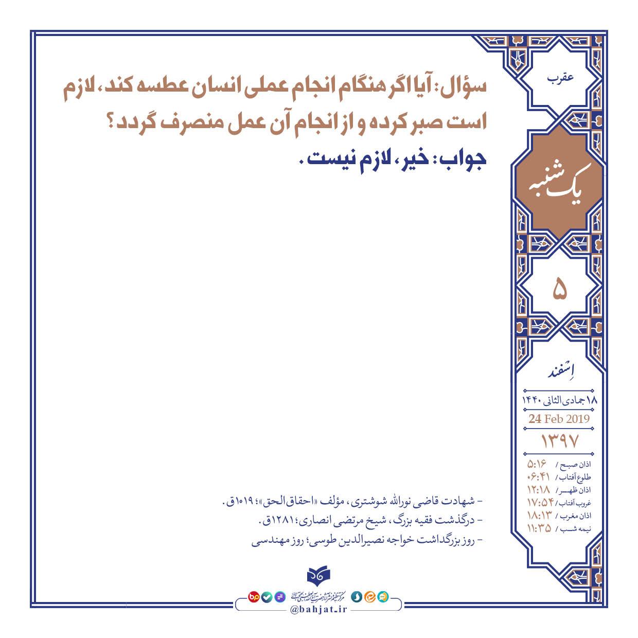 سؤال: آيا اگر هنگام انجام عملی  انسان عطسه كند، لازم است صبر كرده و از انجام آن عمل منصرف گردد؟