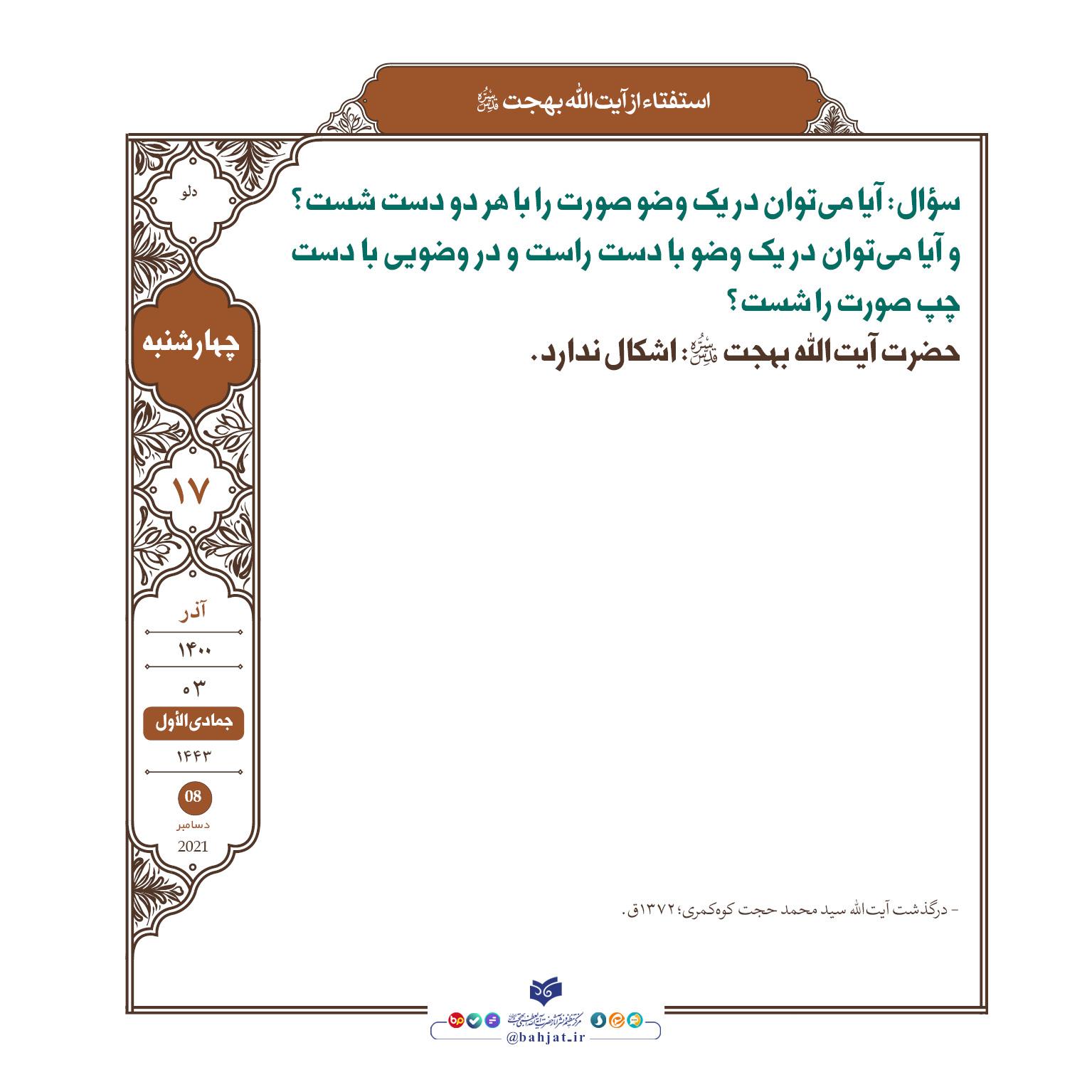 سؤال: آيا مى‌توان در يک وضو صورت را با هر دو دست شست؟ و آيا مى‌توان در يک وضو با دست راست و در وضويى با دست چپ صورت را شست؟