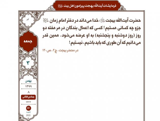 خدا میداند در دفتر امام زمان علیهالسلام جزو چه کسانی هستیم! کسی که اعمال بندگان در هر هفته دو روز (روز دوشنبه و پنجشنبه) به او عرضه میشود. همین قدر میدانیم که آن طوری که باید باشیم، نیستیم!
