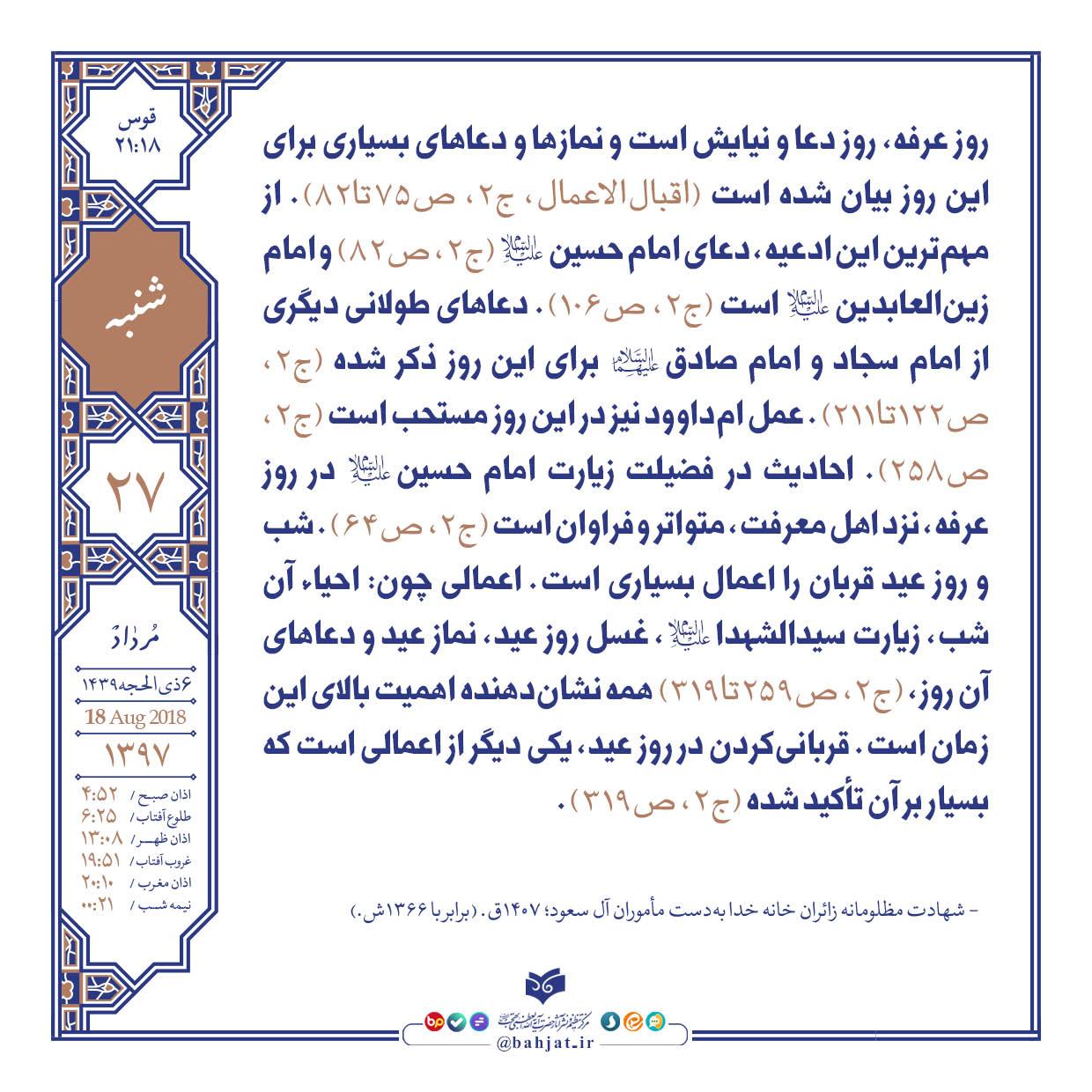 روز عرفه، روز دعا و نیایش است و نمازها و دعاهای بسیاری برای این روز بیان شده است . از مهمترین این ادعیه، دعای امام حسین علیهالسلام و امام زینالعابدین علسهالسلام است . دعاهای طولانی دیگری از امام سجاد و امام صادق علیهماالسلام برای این روز ذکر شده . عمل امداوود نیز در این روز مستحب است . احادیث در فضیلت زیارت امام حسین علیهالسلام در روز عرفه، نزد اهل معرفت، متواتر و فراوان است . شب و روز عید قربان را اعمال بسیاری است. اعمالی چون: احیاء آن شب، زیارت سیدالشهدا علیهالسلام، غسل روز عید، نماز عید و دعاهای آن روز، همه نشاندهنده اهمیت بالای این زمان است. قربانیکردن در روز عید، یکی دیگر از اعمالی است که بسیار بر آن تأکید شده .