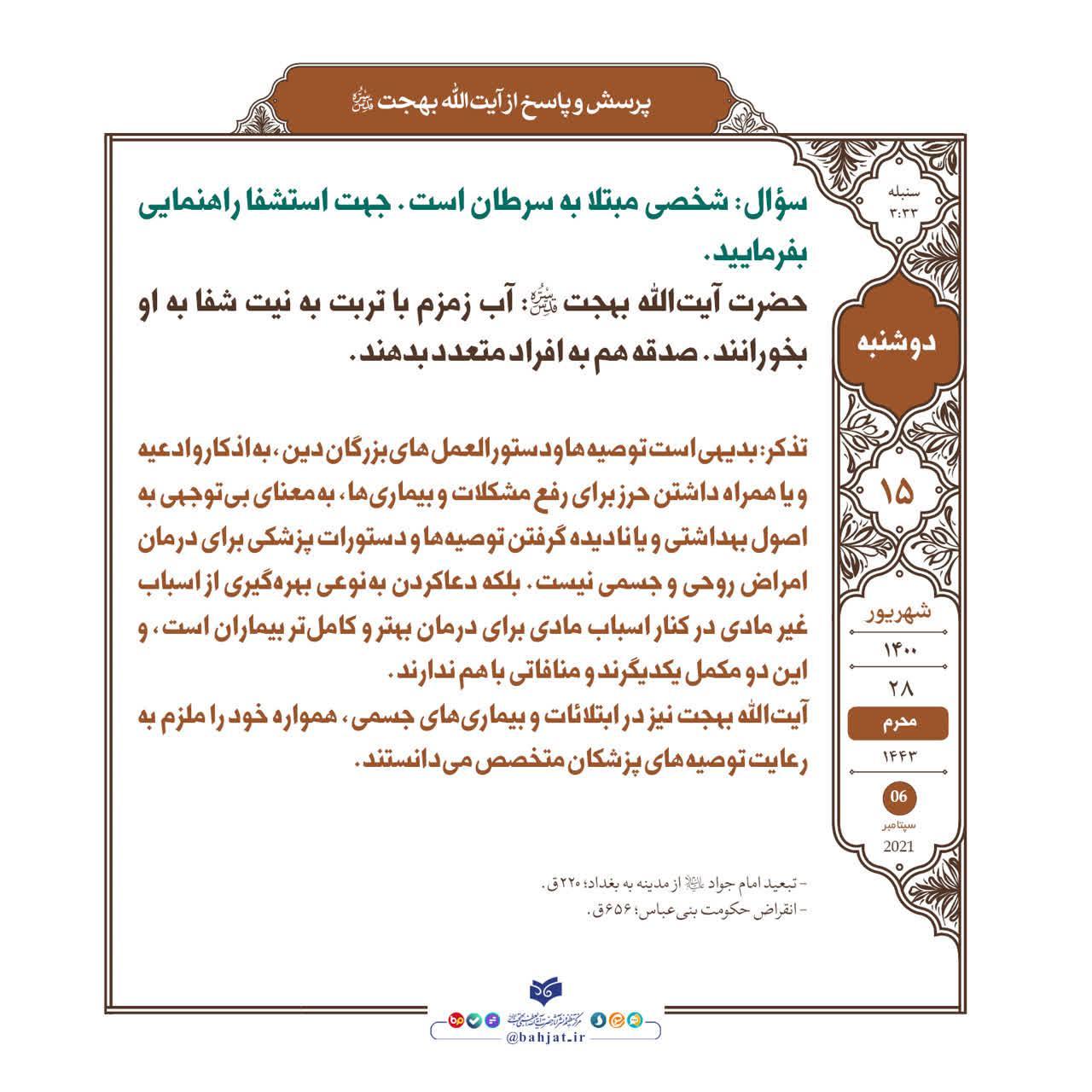 حضرت آیتالله بهجت قدسسره: آب زمزم با تربت به نیت شفا به او بخورانند. صدقه هم به افراد متعدد بدهند.
