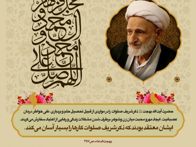 می‌فرمودند: «کسی بخواهد دوستی‌اش و محبتش زیادتر بشود، در اذکار و آداب و… چیزی آسان‌تر از صلواتِ زیاد نیست؛ [شخص] عاشقانه صلوات بفرستد می‌فهمد که چطور محبتش زیاد می‌شود؛ اما به‌شرط عقیده، که بفهمد این‌ می‌کشد او را به طرف معبود خودش و محبوب خودش. خدا می‌داند چه هست در این صلوات: «مَنْ صَلّی عَلَيَّ م...