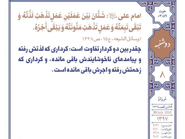 امام على علیهالسلام: چقدر بین دو کردار تفاوت است: کردارى که لذتش رفته و پیامدهای ناخوشایندش باقى مانده، و کردارى که زحمتش رفته و اجرش باقى مانده است.