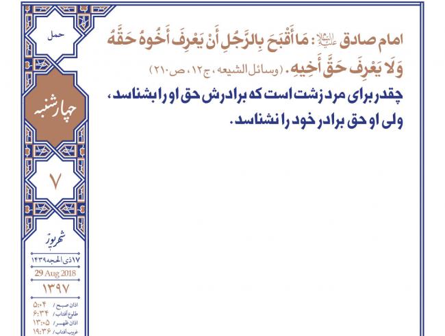 امیرالمؤمنین علیهالسلام: حق برادر خویش را براساس اعتماد به آن چیزی (آن برادری و دوستی و رفاقتی) که بین تو و اوست، ضایع مکن؛ زیرا کسی که حق او را ضایع کردی، دیگر برادر تو نیست.